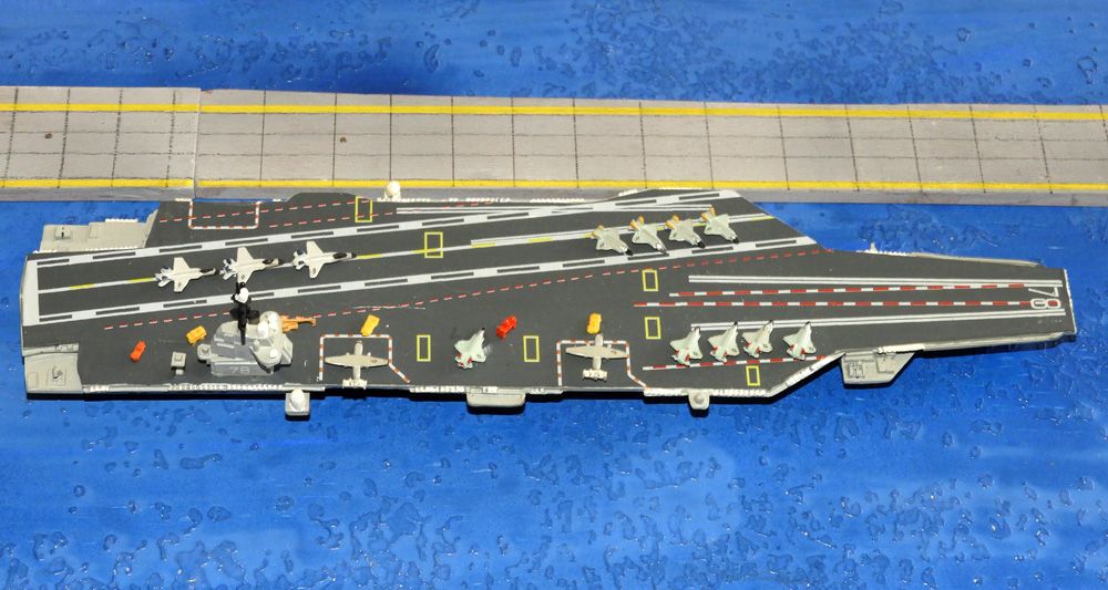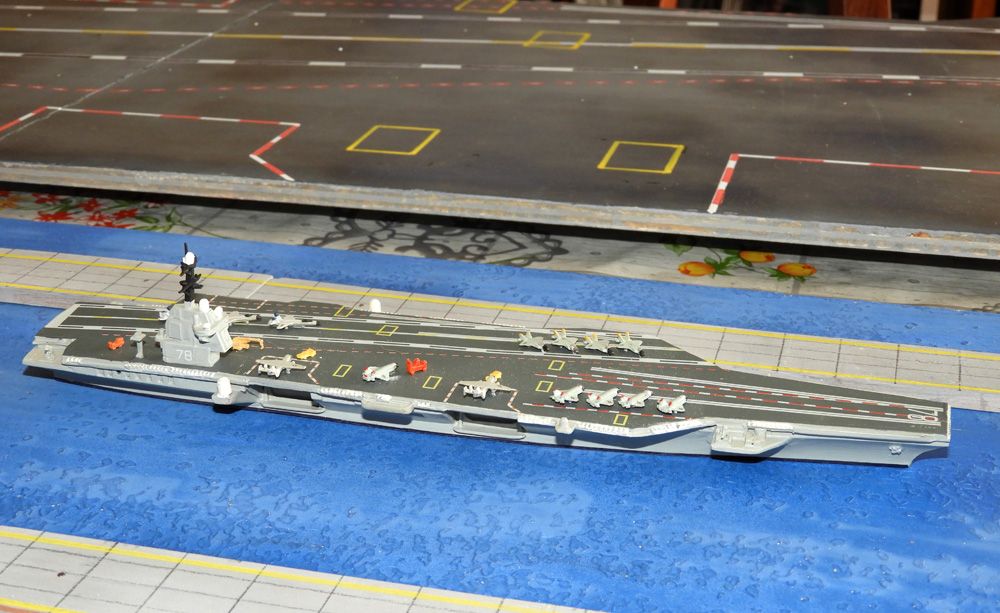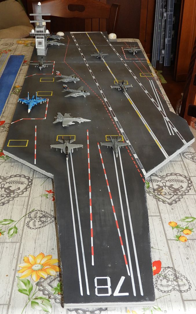 Avendo circa 1.000 modellini di caccia e bombardieri in scala 1:200, Hogan e Herpa perfettamente riprodotti, mi serviva un aeroporto o una piattaforma come layout; quando mi è arrivato il modellino della portaerei "Gerald R. Ford" in scala 1:1250, sono rimasto talmente stupito della sua bellezza che ho deciso di costruirla in una scala idonea per i caccia 1:200.
